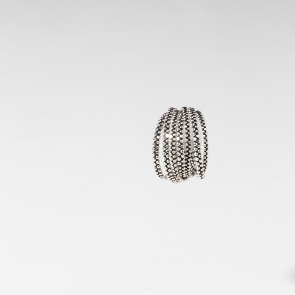 8 liens de chaine facettée argent 925 et fil noir, qui composent une bague à la fois imposante et souple, un vrai bijoux confort….pour un look « Glam Rock »