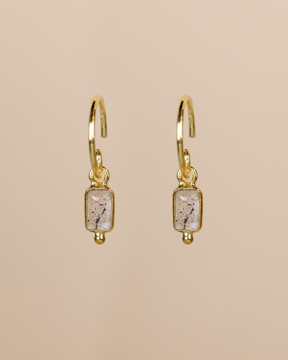 Boucle d’oreille plaquée or avec une labradorite rectangulaire de 4 x 5 mm ornée d’un point.