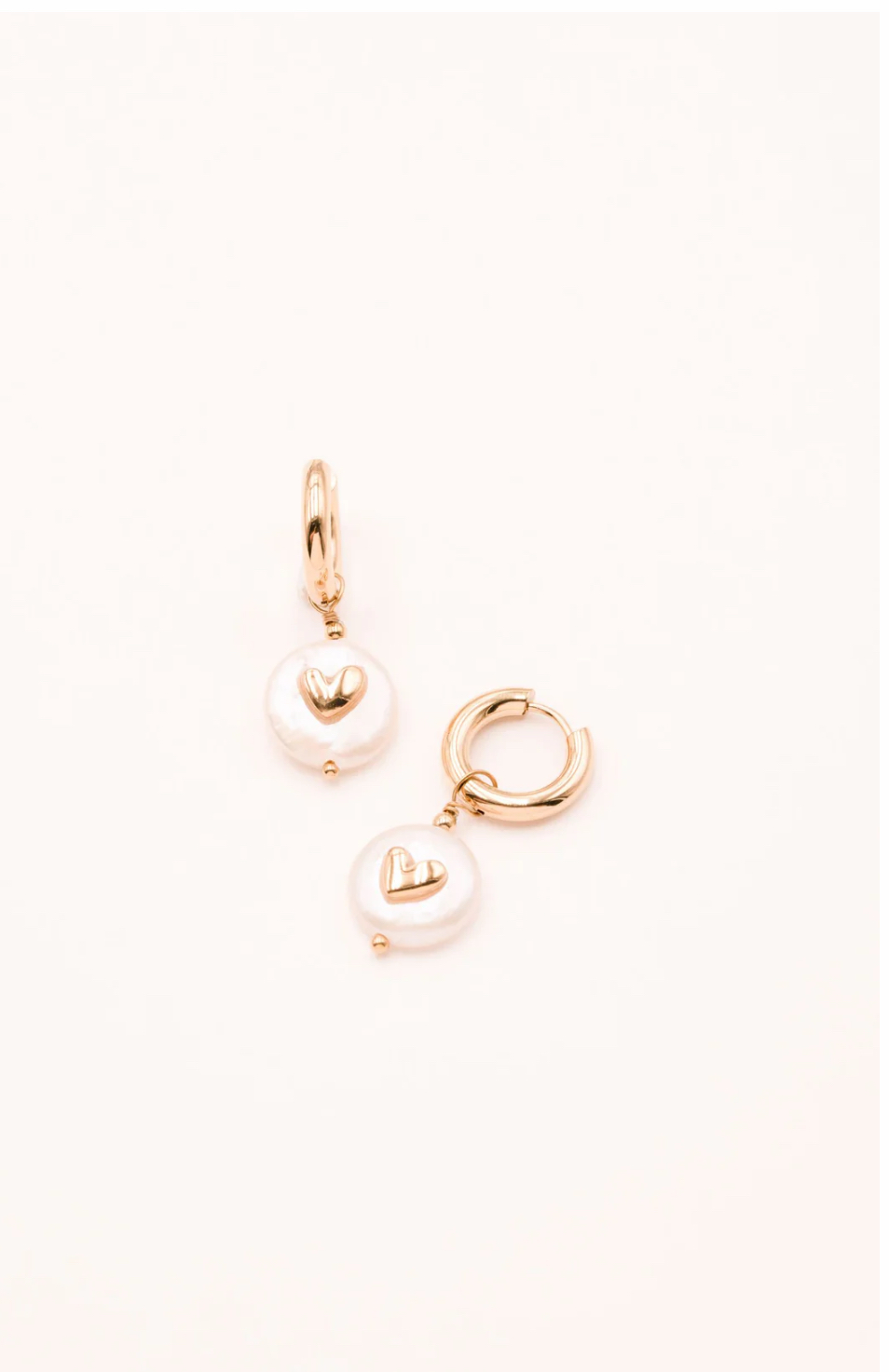 Boucles d’oreilles type créoles avec fermoir à charnière en acier inoxydable composées d’un anneau épais et d’une perle d’eau douce pendante avec un cœur.