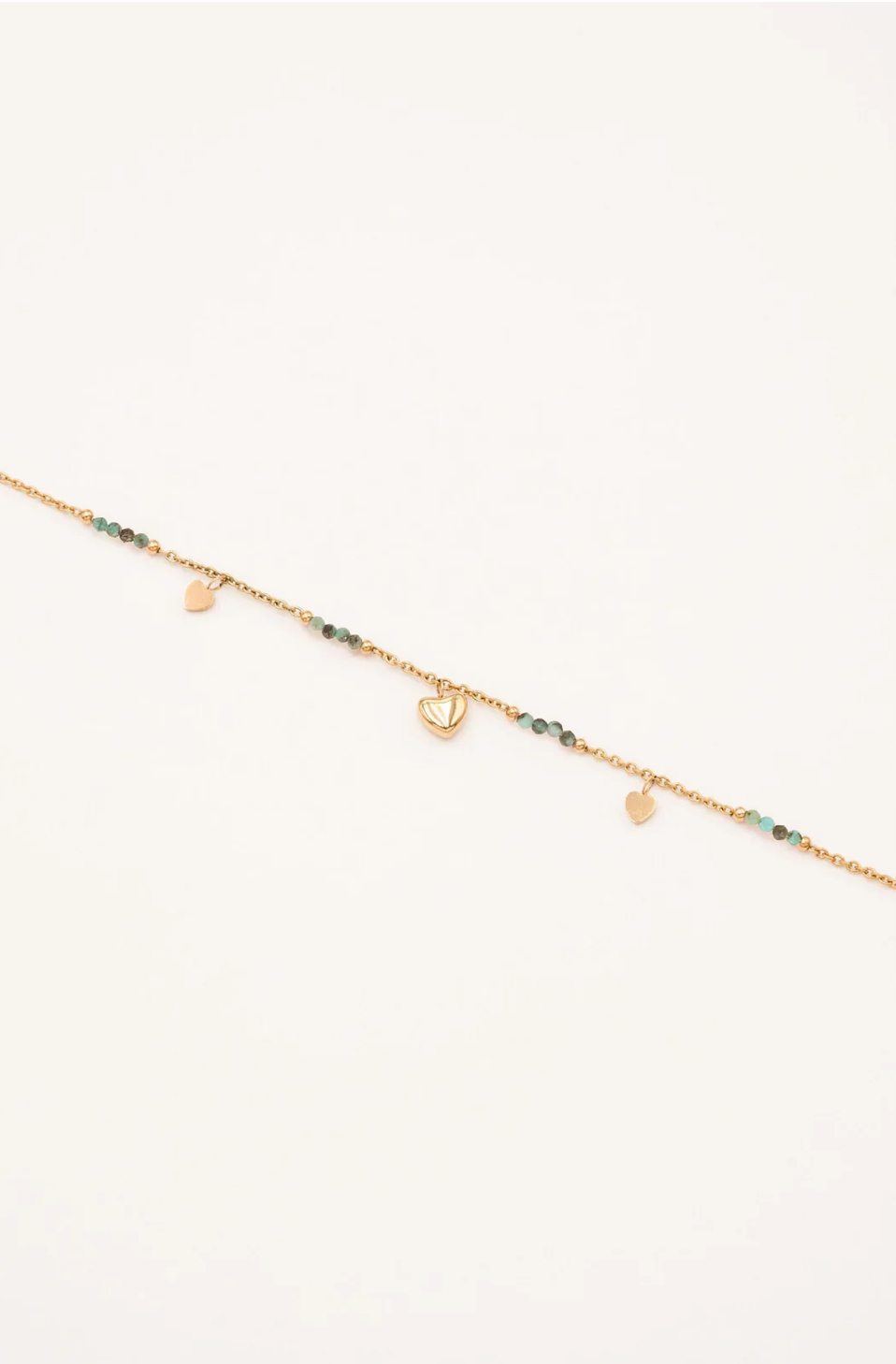 Bracelet sur chaîne en acier inoxydable composé de pampilles coeurs et de série de 4 pierres naturelles rondes.