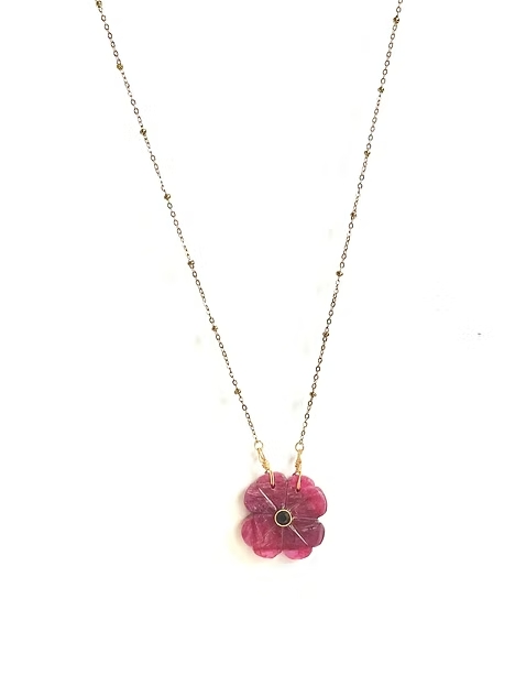La fleur est en Rubis indien (rose foncé) : favorise le courage et la confiance en soi, prospérité, créativité