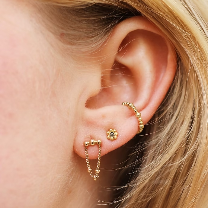 Le earcuff BALI est un bijou d’oreille réalisé avec un fil de petites billes de métal. À déposer au creux de l’oreille, il viendra ajouter une touche d’éclat sur le lobe.