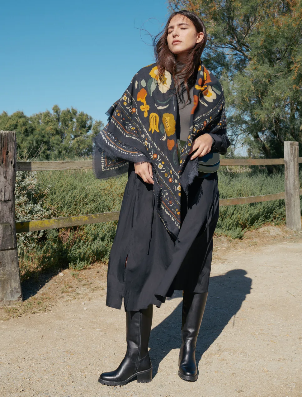 Voici le foulard Balkans noir, le hit de cette saison ! Confectionné en laine et soie, il apporte une douceur et une élégance inégalées grâce à ses motifs fleuris et ses couleurs éclatantes, qui s’accordent avec toutes vos tenues. Sa forme carrée vous offre une grande flexibilité de port : autour du cou, sur la tête ou accroché à votre sac, il rehausse votre look quotidien avec une touche de légèreté et de style.