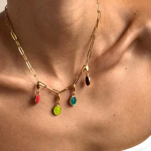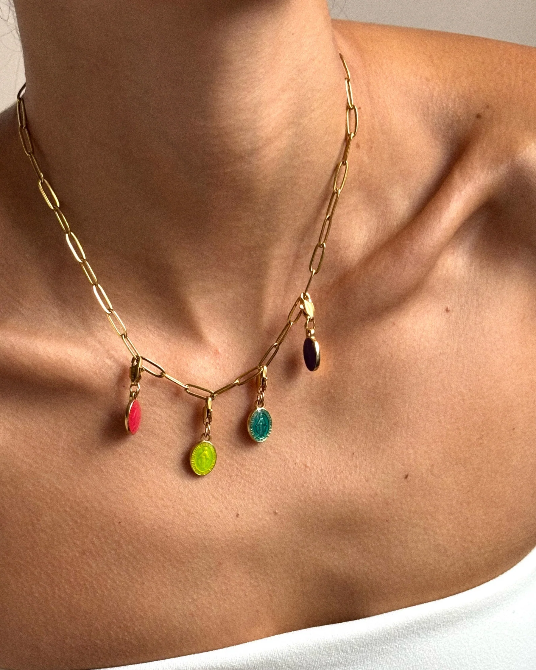 Une touche de couleur sous la forme d’un pendentif ensoleillé. Notre chars mini Madonne reprend les codes de la médaille miraculeuse tout en les modernisant. Ce pendentif vernis s’attache volontiers à un bracelet ou un collier, en fonction de vos envies.
