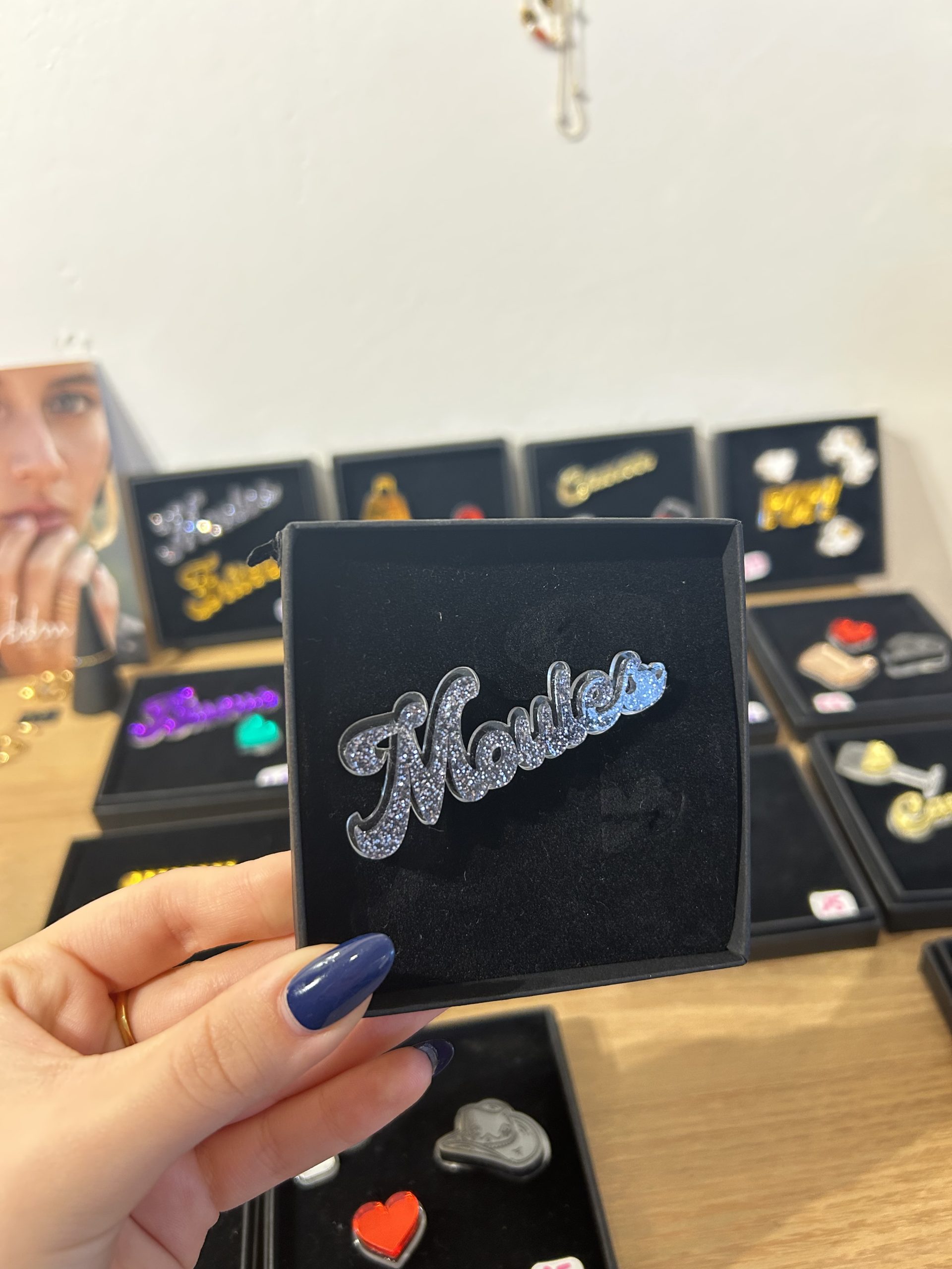 Pin’s en plexi miroir, fait main par une créatrice de Romainville.