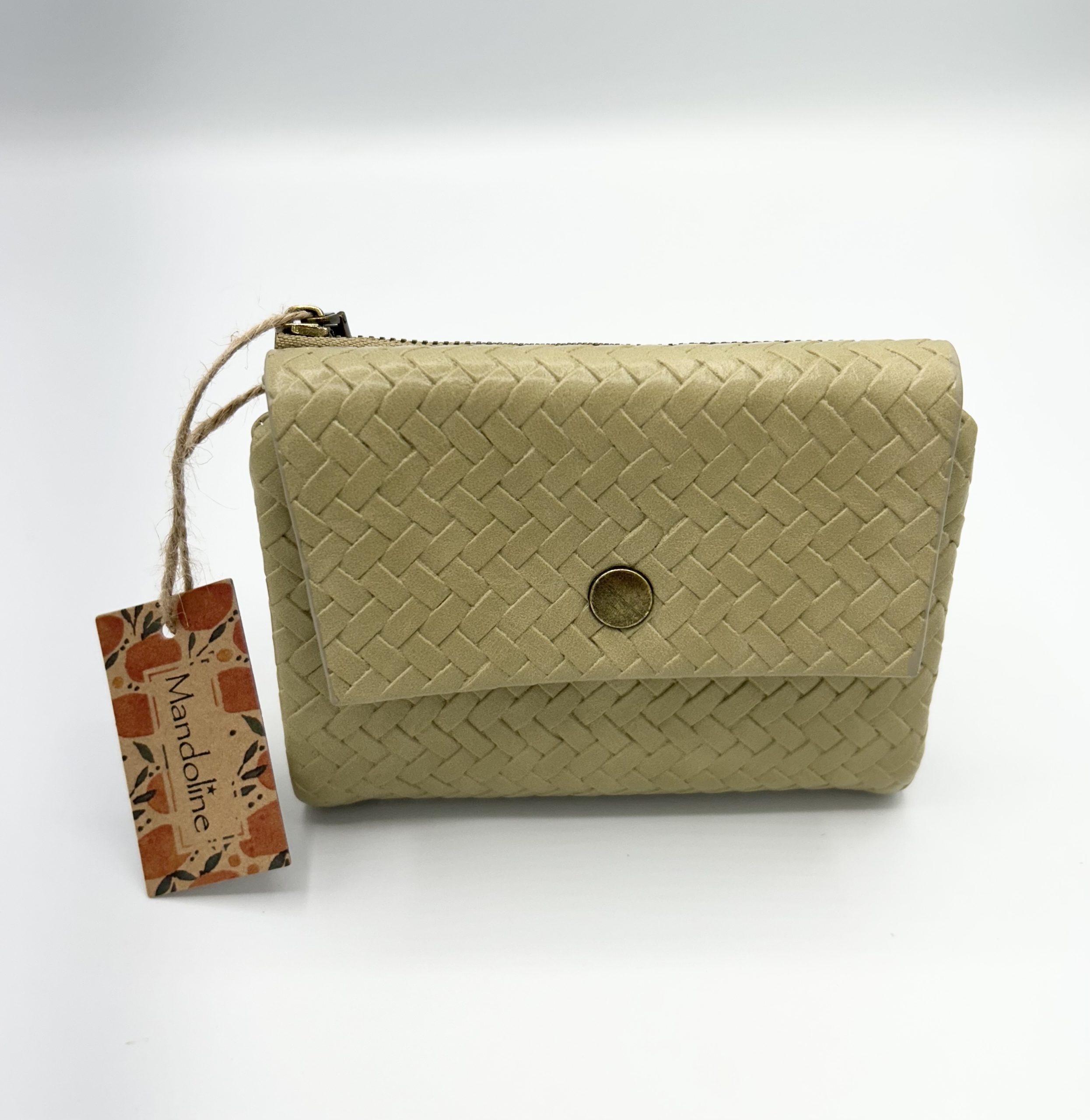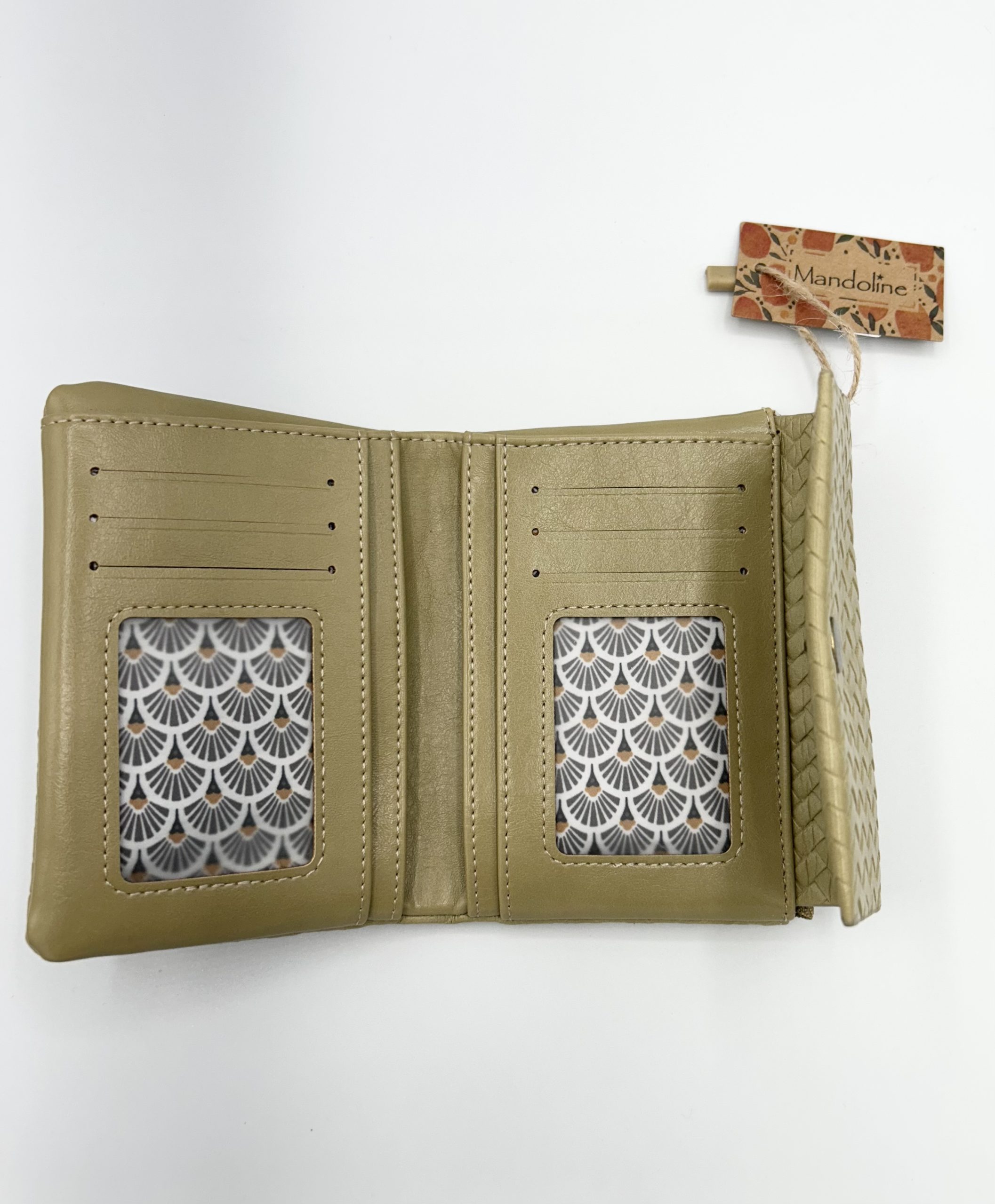 Porte monnaie de couleur taupe avec plusieurs rangements pour les cartes dont un rangement fermé pour les pièces