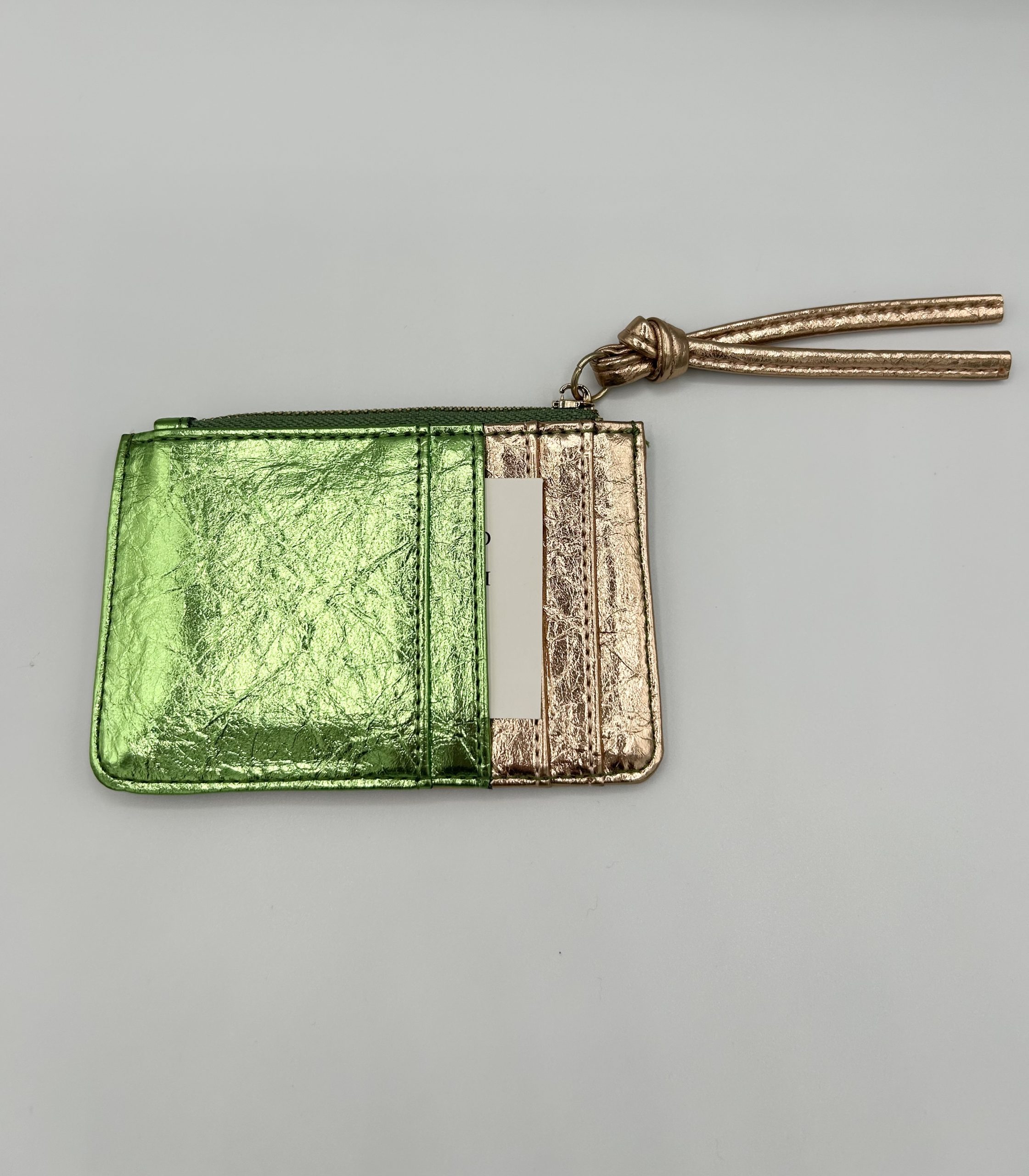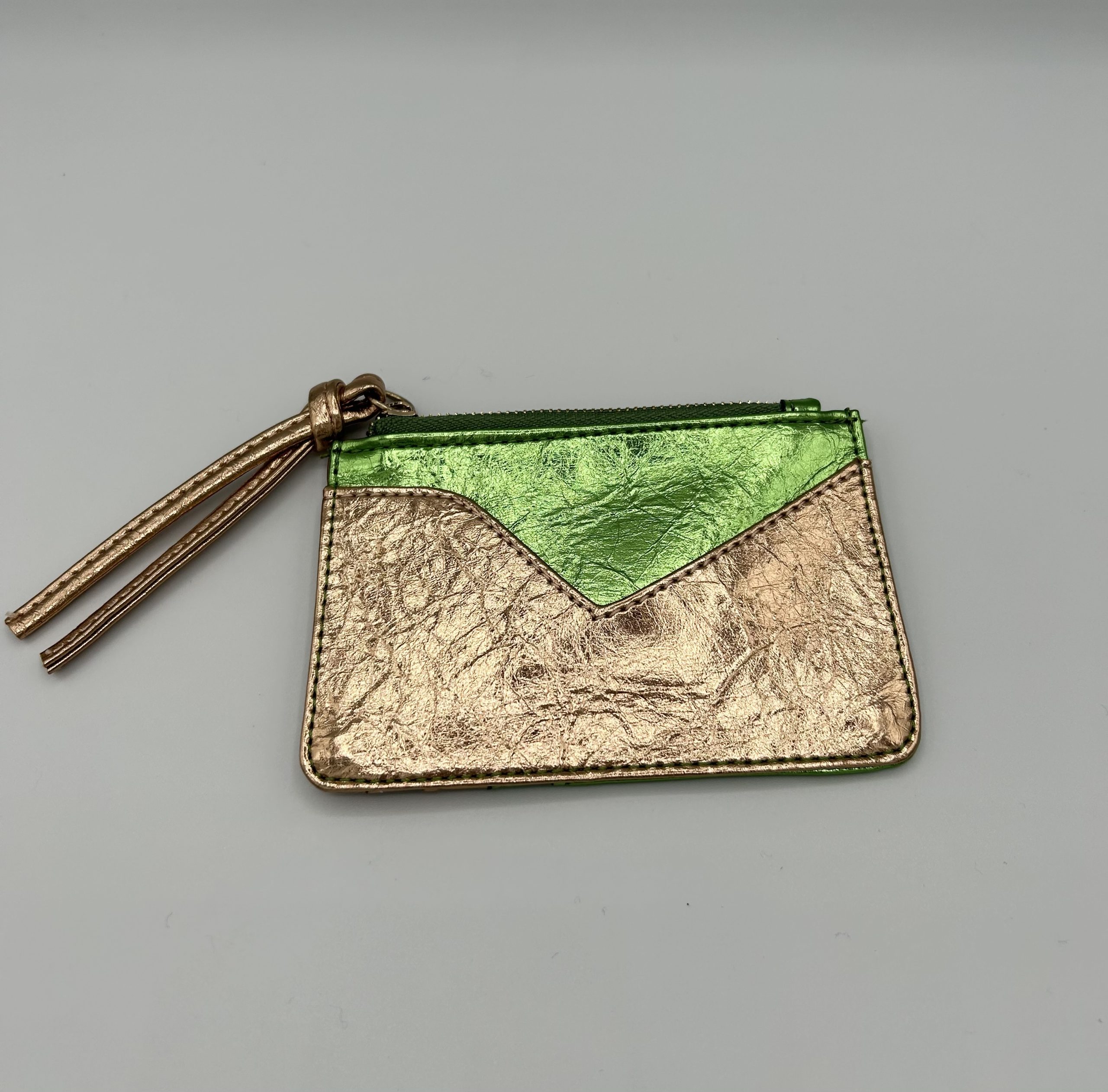 Porte-monnaie en cuir de vachette à reflets irisés. Fabriqué en Italie.