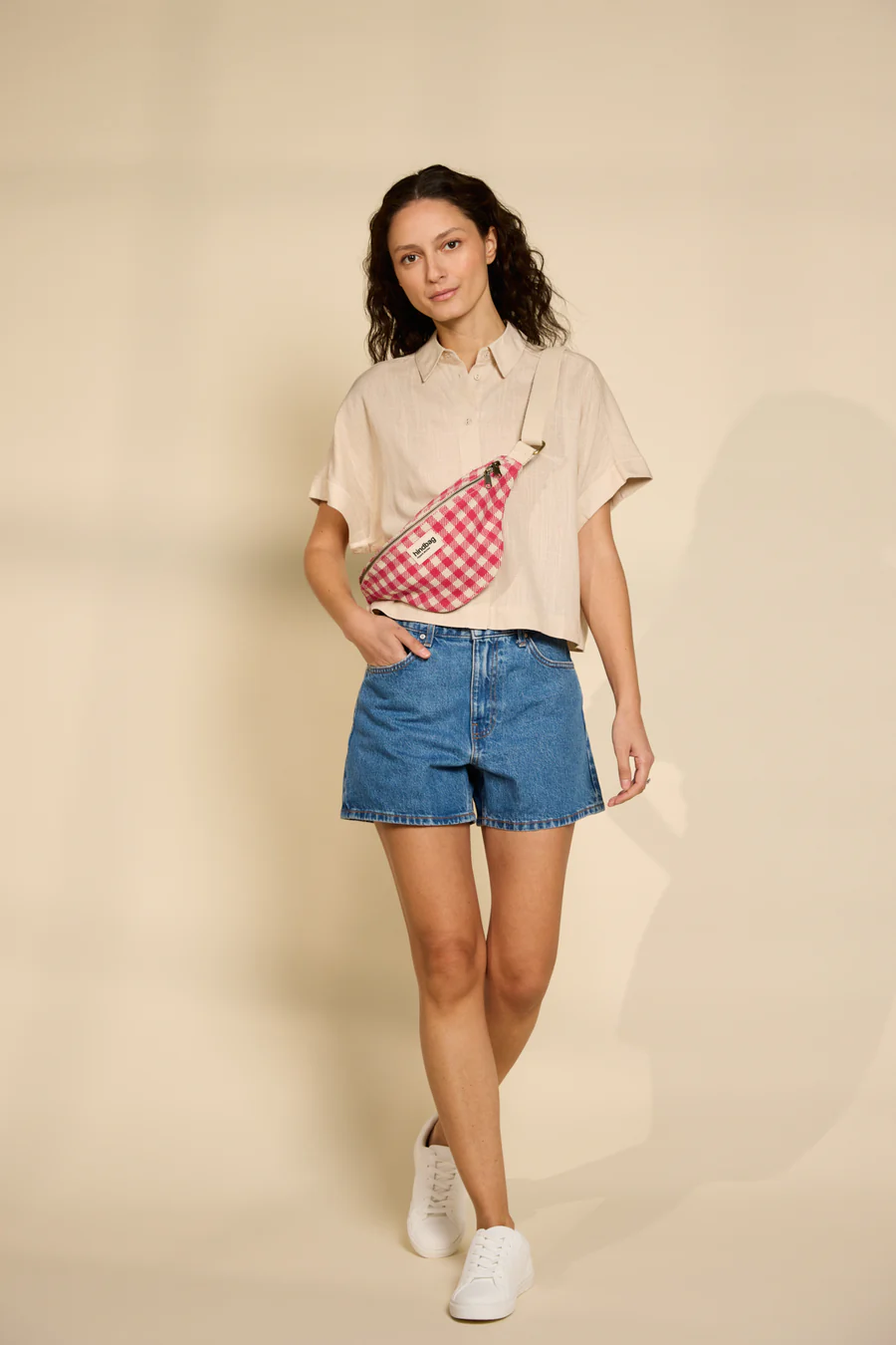 Olivia, c’est le sac banane qui va vite se rendre indispensable ! Avec son coton bio très épais et solide, elle transporte vos indispensables du quotidien sans se déformer et à l’abri des petites pluies. Grâce à son anse réglable, vous pouvez la porter aussi bien sur un manteau épais en hiver que sur un t-shirt léger l’été. Sa fermeture éclair en double zip hyper pratique vous permettra de porter votre sac en bandoulière sur l’épaule gauche ou droite sans que vos essentiels ne tombent à l’ouverture. Sac banane disponible en plusieurs coloris. Décliné en rose ou en vert, craquez pour le motif Vichy, la tendance française de cet été. Confectionné à partir d’un mélange de coton et de jute bio, il ajoutera une touche vintage à vos looks.