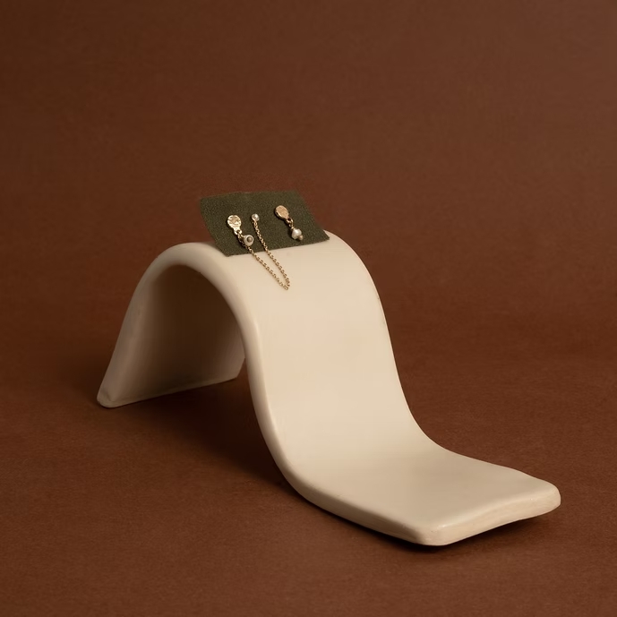 Les puces ASTRA sont parfaites pour les personnes ayant plusieurs trous. D’un côté, une puce simple avec une pastille martelée qui laisse pendre une perle et de l’autre, une puce double avec une pierre sertie et une chaînette venant faire un pont entre deux trous.