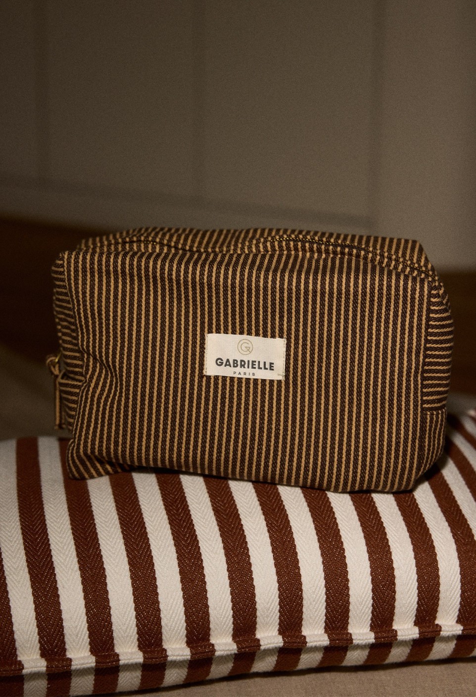 Trousse de toilette en coton doublée et imperméable. Pratique et élégante, elle offre deux poches intérieures et une anse latérale.